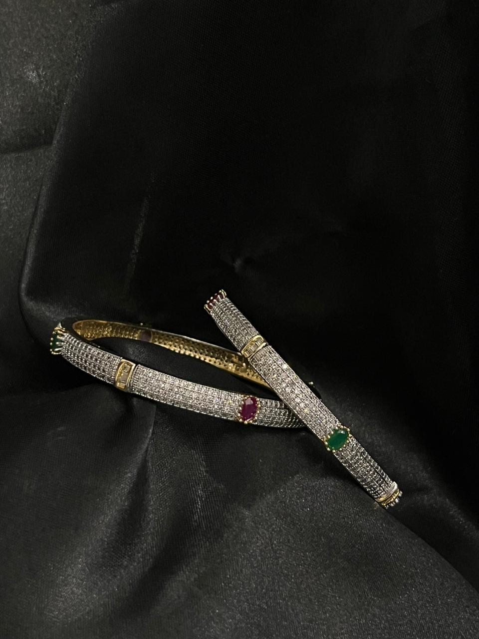 The Royal Gleam Duo Bangles are a perfect harmony of elegance, brilliance and regal charm. Designed with meticulous detailing, these bangles showcase a dense layer of micro-pave stones that create a radiant, high-lustre finish. Their sleek silhouette is elevated with two striking gemstone accents – one in deep ruby red and the other in vibrant emerald green – adding a rich, royal touch that makes the design truly distinctive.
